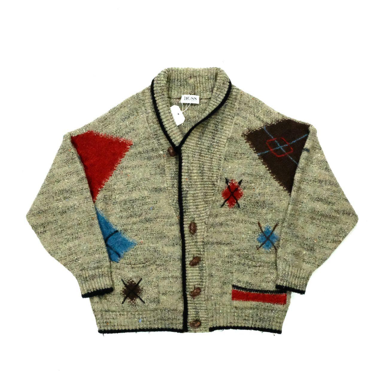 VTG 90s Hugo Boss Knit Cardigan. Cowl Neckline. Abstract/geometric pattern. Grey/beige marl. leather toggle buttons.