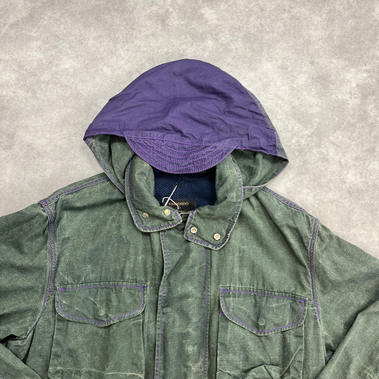 Amazing robust quality cotton valentino safari style jacket. Nice fade and quality fabric construction. Subtle green tones and purple blue stitchwork and hood. Optional removable hood. Original 1980s piece good as new.
