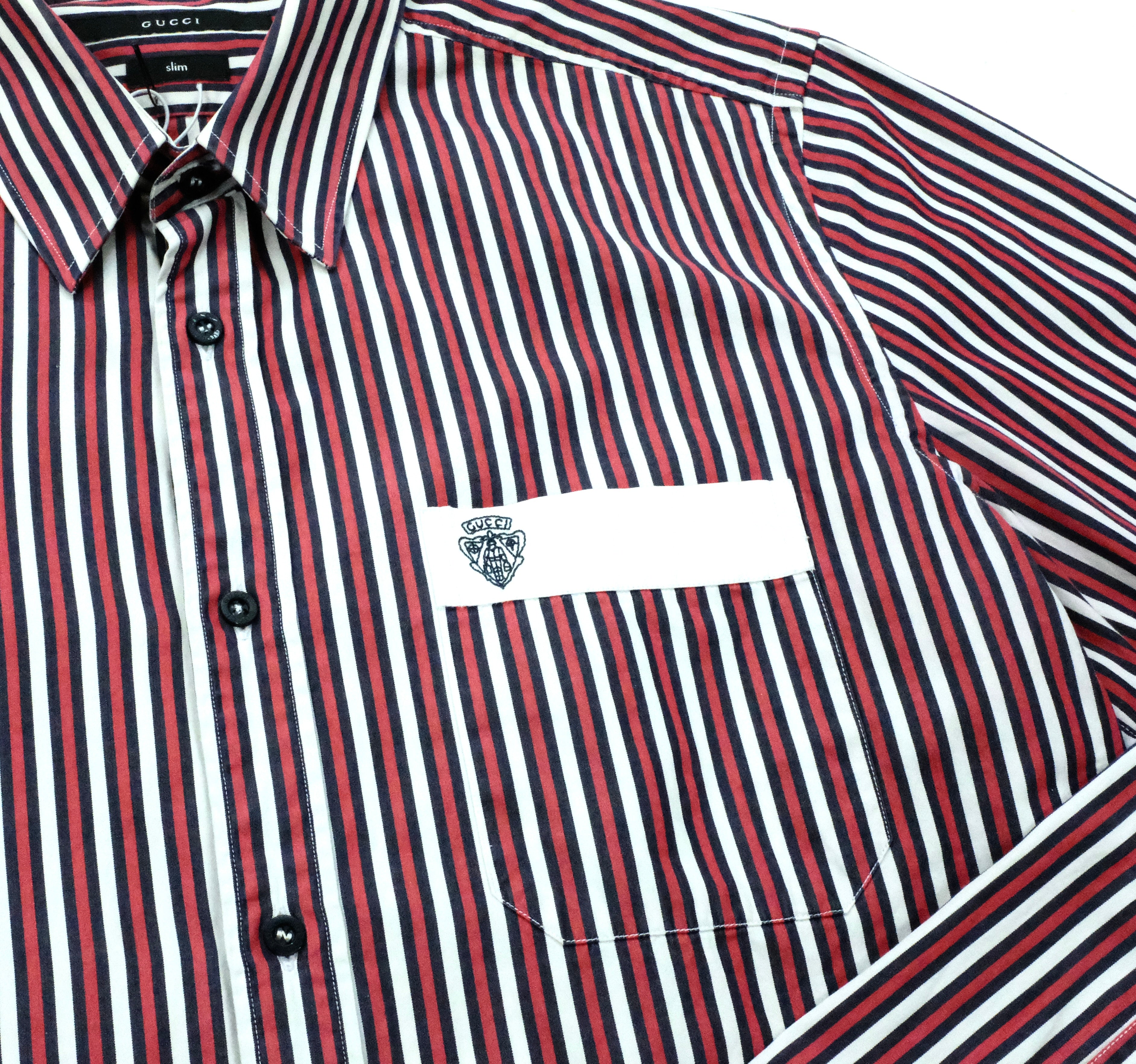 VTG Gucci Striped Shirt. Slim fit. Preppy smart style. Navy/red/white colour-way. Quality cotton construction. Full button. Great condition