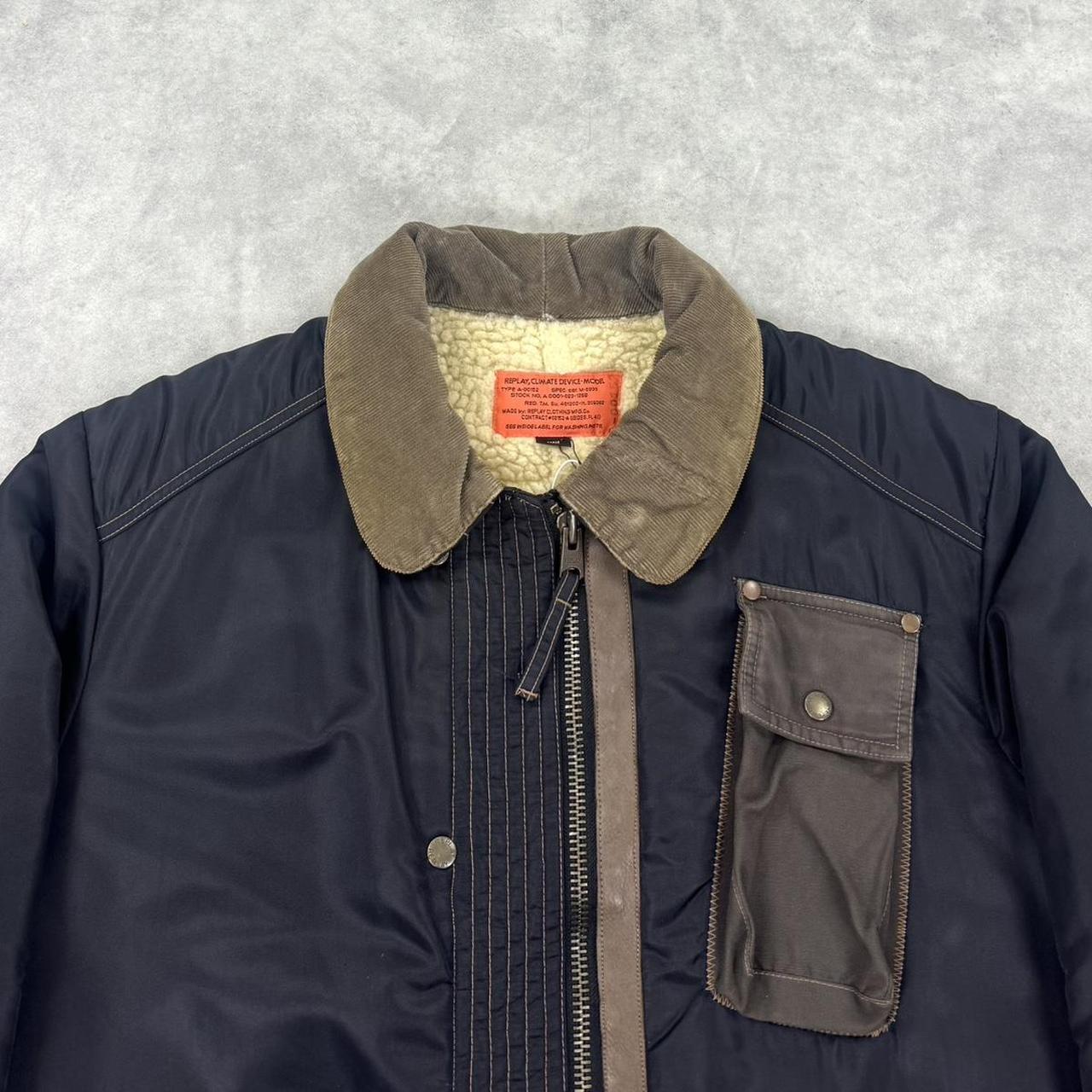 Vintage 90s Replay jacket. Sherpa fleece lining. Multiple zip pockets. Contrast leather trim details. Size L